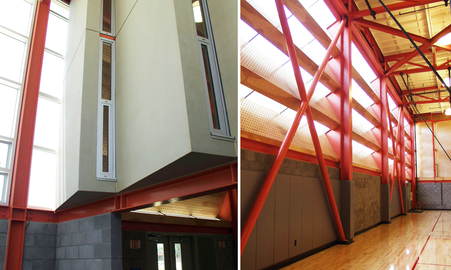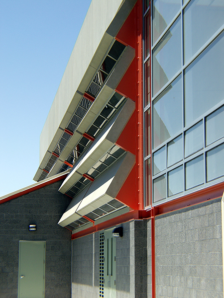 New 10,000 square foot gymnasium with collapsible bleachers, six retractable basketball hoops and aluminum-framed skylights. Project included GFRC panels and extensive site work including landscaping, turf block, and replacement of granite running track.